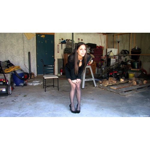 Cali's arrives after a two-hour drive and her need to use the bathroom. She pees into the toilet (while being filmed) before we get started. Later, during the filming of a bondage story, there is a break and Cali immediately crosses her legs and begins wiggling around. She says she is ready for the next scene, meaning a desperation scenario, but we have not filmed much of the bondage story yet. She says she will hold it to make her desperation more spectacular, so we resume. It takes about twenty five minutes to complete the bondage movie, and we re-start this one with Cali still tied to a chair but being released. She remarks on how badly she needs to pee now that freedom is imminent, except of course she won't be allowed to pee. Cali is just kept waiting and she is clearly struggling to hold her pee. She tries to urge things forward, but it is enough to just keep her there and watch her pee dancing and desperate expressions, not to mention the little gasps and moans as she keeps waiting. Towards the end, Cali is encourages to lock her wrists in handcuffs hanging from the ceiling, set up for a later bondage scenario, and she agrees to do so only if the cameraman goes to fetch the key. Cali then stands with her arms above her head, no longer able to bend forward to ease the pressure on her full bladder. She rubs her legs together and squeezes up her features as she tries to keep holding her pee, but she can't. She wets herself, and does she ever pee gallons! The act of release goes on for quite some time as Cali lets go. The pee running down her legs is filmed in its entirety.