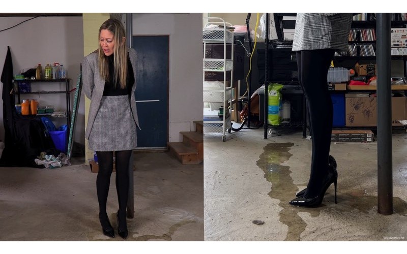 This video shows highlights of Sinthia drinking fluids to start the desperation cycle, followed by excerpts of what was filmed subsequently leading up to the full desperation sequence. Commissioned as a custom, the buyer wanted to have a record of everything that happened from the moment Sinthia started drinking until she was finally forced to wet herself. Rather than a long and uneventful video which is not very saleable, he asked us to film a forced stripping video followed by a bondage video (which could be sold separately). In the latter, Sinthia is chained to a chair for about forty minutes as the bondage story is filmed. By the time we were ready to film a pee scenario, Sinthia was indeed desperate to go. She had to remain secured to the chair while preparations were made in the basement (she complains that she can't even cross her legs), and we get to see her reacting when no one else is present - it was very easy to forget that a camera was still running. Sinthia's growing discomfort as her bladder quickly filled is visible during most of the bondage sequence, although anyone who didn't know the background to it would probably not be aware. By the time we took Sinthia down into a cold basement, which absolutely did not help her condition, she could barely move because her bladder was so full (ever noticed how the girls move less and less as desperation gets serious). Finally, we started the scenario where, after an hour and twenty five minutes from when she began drinking (40 fluid ounces), she would soon be able to pee. The storyline is a simple situation where some bad guy has access to her bank account, and if she pees before he gives her permission, he'll transfer all of her money away. These intruders are so mean. The peeing sequence is seen from the front and the side using split screen.