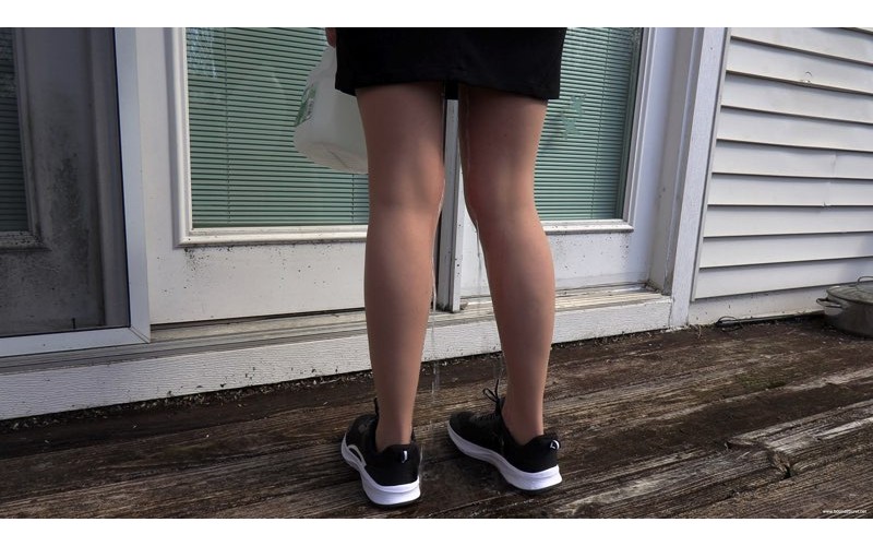 Sinthia is a secretary who arrives home desperate to pee. She is trying to train herself to control her bladder when it is full so that she can be more efficient at work. She therefore makes herself wait for the bathroom. She performs some mundane tasks while pee dancing and struggling to hold her pee. She washes dishes and cleans surfaces, breaking up the chores by sitting and responding to text messages on her phone. She is truly feeling the pressure of her full bladder now, but she is determined to wait as long as possible before running to the bathroom for relief. After finishing her texts, she suddenly remembers that she has not filled the bird bath today. This involves filling a gallon jug with water, an act which almost makes her wet herself, then carrying it outside to fill the bird bath, closing the door behind her to keep the warmth in the house. Watching the water stream from the jug makes her squirm; she is very close to losing control now. She decides that, once she goes back inside, the time has come to use the toilet. When she returns to the door, however, she discovers that she has accidentally locked herself out. She shakes the door handle in panic, now at the point where she cannot hold it any longer. She loses control and pee streams down her legs onto the deck. There's so much of it! It's a huge relief, but now she is outside in the cold wearing wet panties. What is she going to do now?