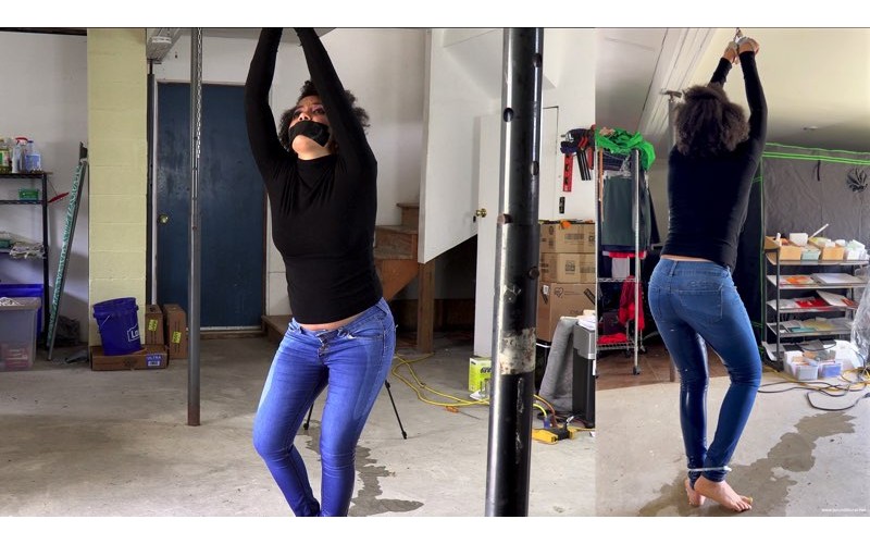 To make this video as dramatic as possible, a lot of time was taken to prepare. Over forty minutes, Monica drank two bottle of water and a can of soda, taking in 40 fluid ounces (1.2 liters) of liquid. We sat and chatted to keep her occupied while the pressure on her bladder built, taking the preparation time to more than an hour. By the time she finally stood up and realized how full her bladder was, she was suddenly very desperate to pee. She was anxious about having to hold it for at least another twenty minutes, and admitted that she might not make it. We spent some minutes getting things set up - getting the chain for the handcuffs to the right length, securing her ankles, and positioning cameras, while Monica stood there concentrating hard on not losing control of her bladder. Her body is tense as she fights to hold it while literally bursting to go. Finally, she was left alone with instructions to wait at least fifteen minutes. She didn't even manage three; she just couldn't hold it. The fact that her bladder was overfull and stretched to its limit is manifest in the amount of pee she released - it not only drenched the jeans, but spread across the floor in two directions, traveling a long way from where she stood. Even more telling is that she wet herself a second time about half way through the video, releasing no small amount either. In addition to the story-line, this video contains nine minutes of behind the scenes footage. At the end, Monica pulls down her jeans to show off her wet panties.